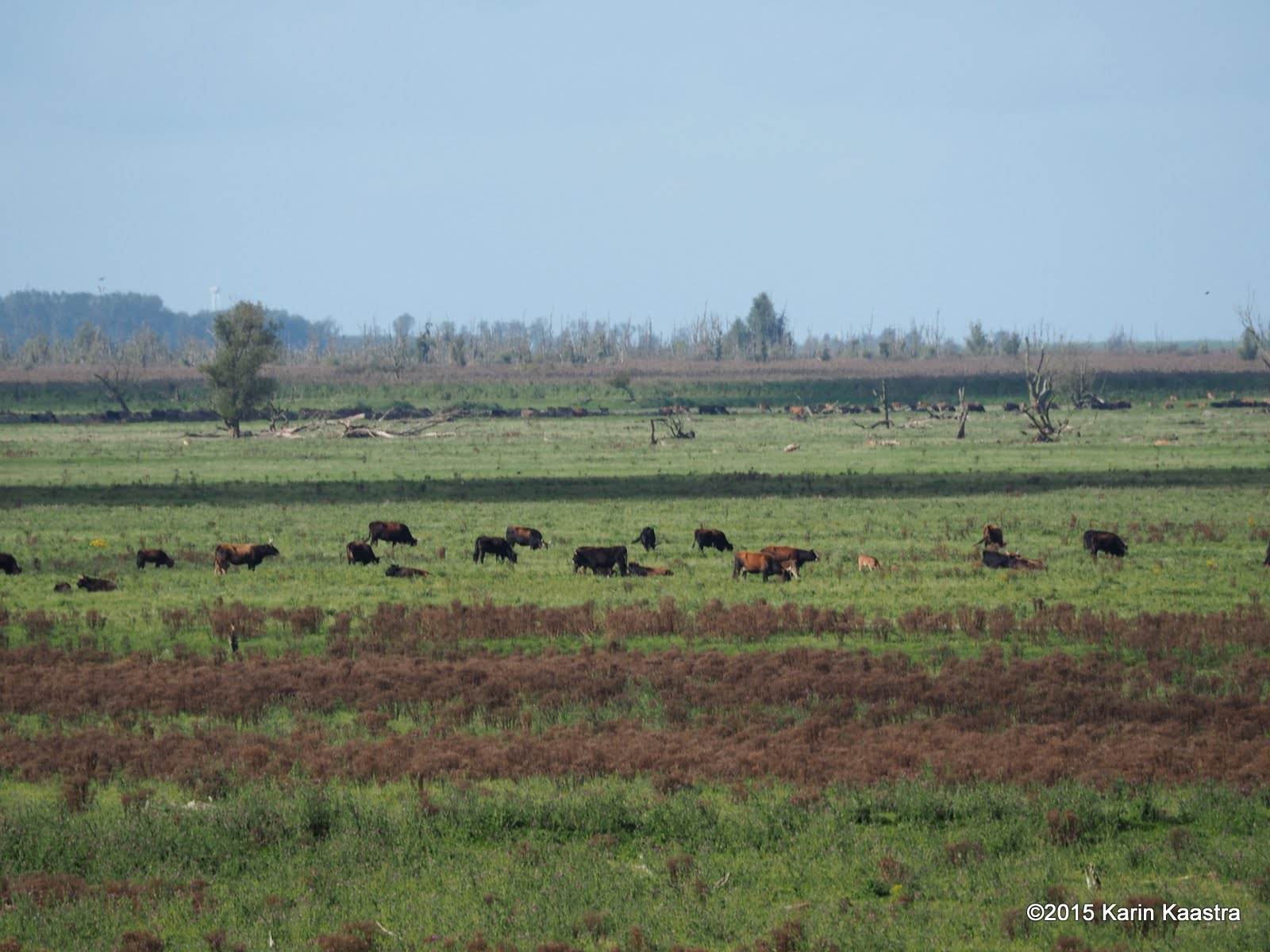 De reis ging via de Oostvaardersplassen, waar in de verte vele herten en Konikpaarden te zien waren met de verrekijker.